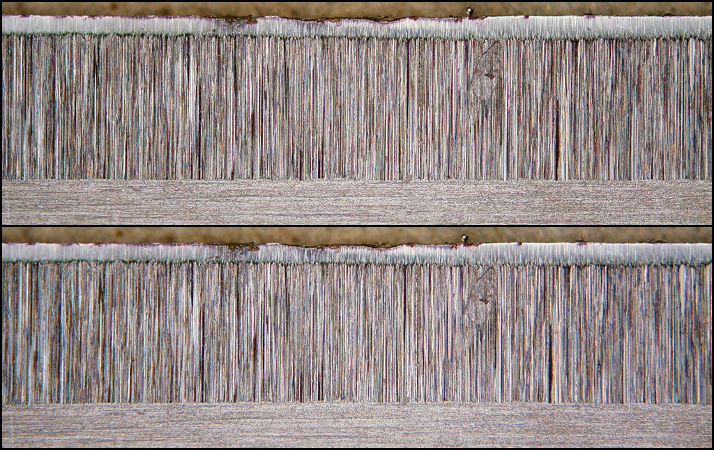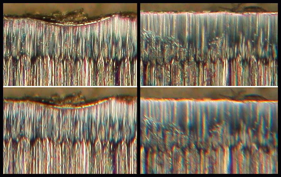 The first comparison (below) is made up of the lower portion of the images where the blade edge ran through the center of the image. On top is the NFK 1.67. The bottom half is the NFK 2.5 elevated in the tube, and camera lowered, to provide a similar (1.67X) magnification.