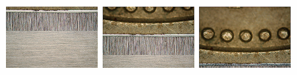 I photographed the edge of a well used stainless steel razor blade (placed on top of a coin). First I used the NFK 1.67X. Then I photographed the same compositions using a NFK 2.5X that was slightly elevated in the trinocular tube in order to provide the same magnification as the 1.67X. Three separate images were made. I ran the edge through the top of the frame, the center, then at the very bottom.